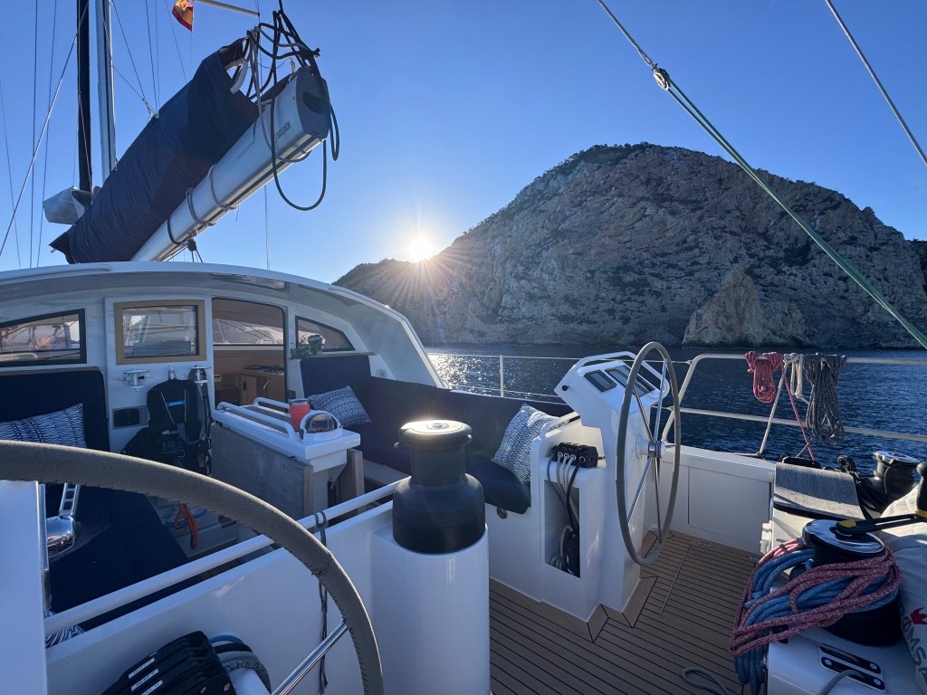 No wind. That’s the whole story of this passage, really. We slipped lines from San Antonio and pointed Spindrift east toward Mallorca under bright sun and flat calm seas. Not a ripple. Not a puff. Flat enough to spot the basking sunfish. Lots of sunfish. Motor and motor and motor. Sixty-three nautical miles of diesel-powered not sure what to call it.